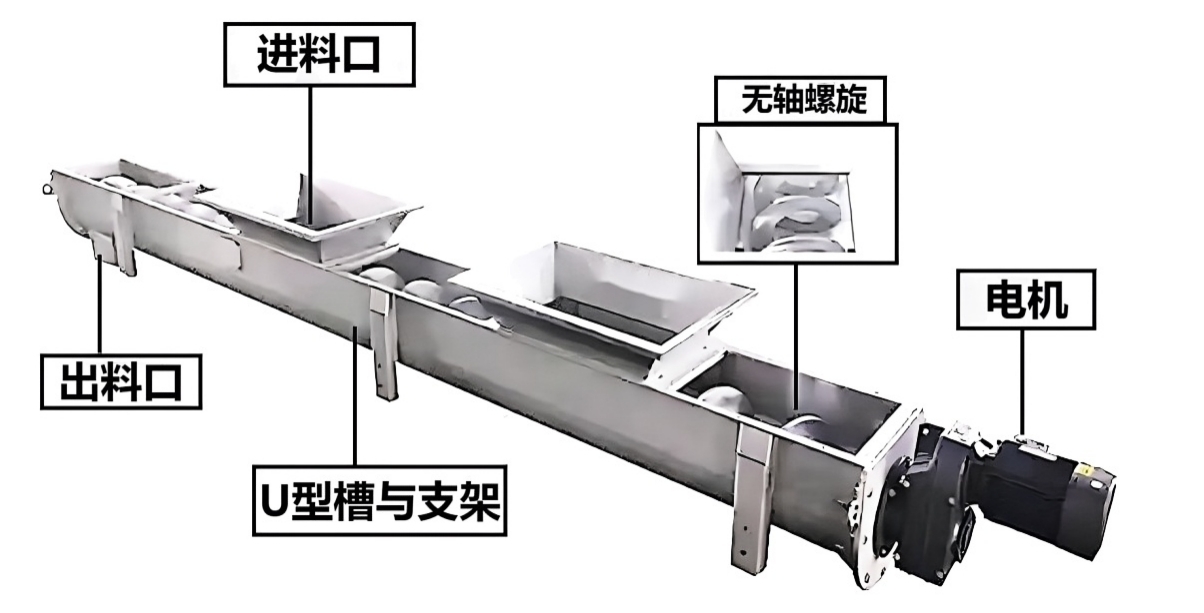 无轴螺旋输送机是一种非常常见的输送设备,常用于输送栅渣或污泥等物料。该机器由多个重要的部件组成,包括驱动机构、U型槽与支架、无轴螺旋、衬条、盖板、进料口、出料口以及紧固件等部分。 一、无轴螺旋输送机的核心结构 无轴螺旋输送机采用一体式螺旋叶片直接缠绕在驱动端头上。其主要由以下部件组成: 1.1 无轴螺旋叶片:通常采用高强度耐磨钢或不锈钢制成,整体呈带状螺旋,无中心支撑,可避免物料缠绕堵塞。 1.2 U型槽体:作为物料的输送通道,内衬耐磨材料以降低摩擦阻力。 1.3 驱动装置:包括电机、减速机等,为螺旋叶片提供旋转动力。 1.4 进料口与出料口:根据工艺需求设计位置和尺寸。
